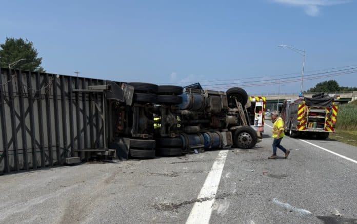 Gray, ME – A tractor trailer rollover on I-95 northbound near Exit 63 in Gray caused significant traffic delays and forced a full highway closure today, as emergency crews rushed to clear the scene and restore normal flow.