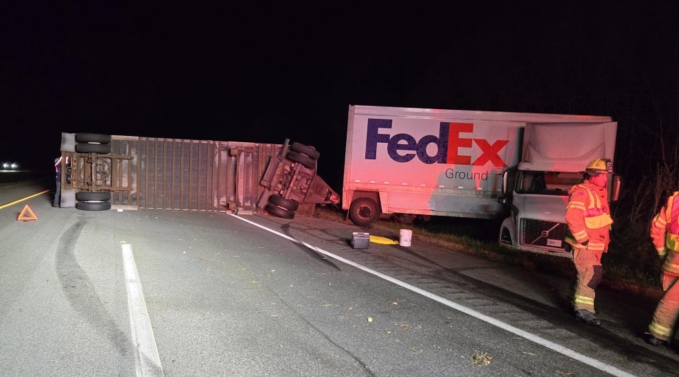 Michigan City, IN – All westbound lanes of the Indiana Toll Road were shut down Sunday night after a FedEx Ground semi truck overturned near mile marker 45, according to the Indiana State Police Lowell Post. The crash occurred approximately six miles east of the Michigan City exit, prompting a swift emergency response and significant traffic delays.
