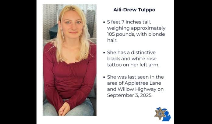 According to the Sheriff’s Office, Aili-Drew Tulppo was reported missing after she was last seen on Wednesday, September 3, 2025, in the area of Appletree Lane and Willow Highway. Authorities say Tulppo is described as 5 feet 7 inches tall, weighing approximately 105 pounds, with blonde hair. She also has a distinctive black and white rose tattoo on her left arm.