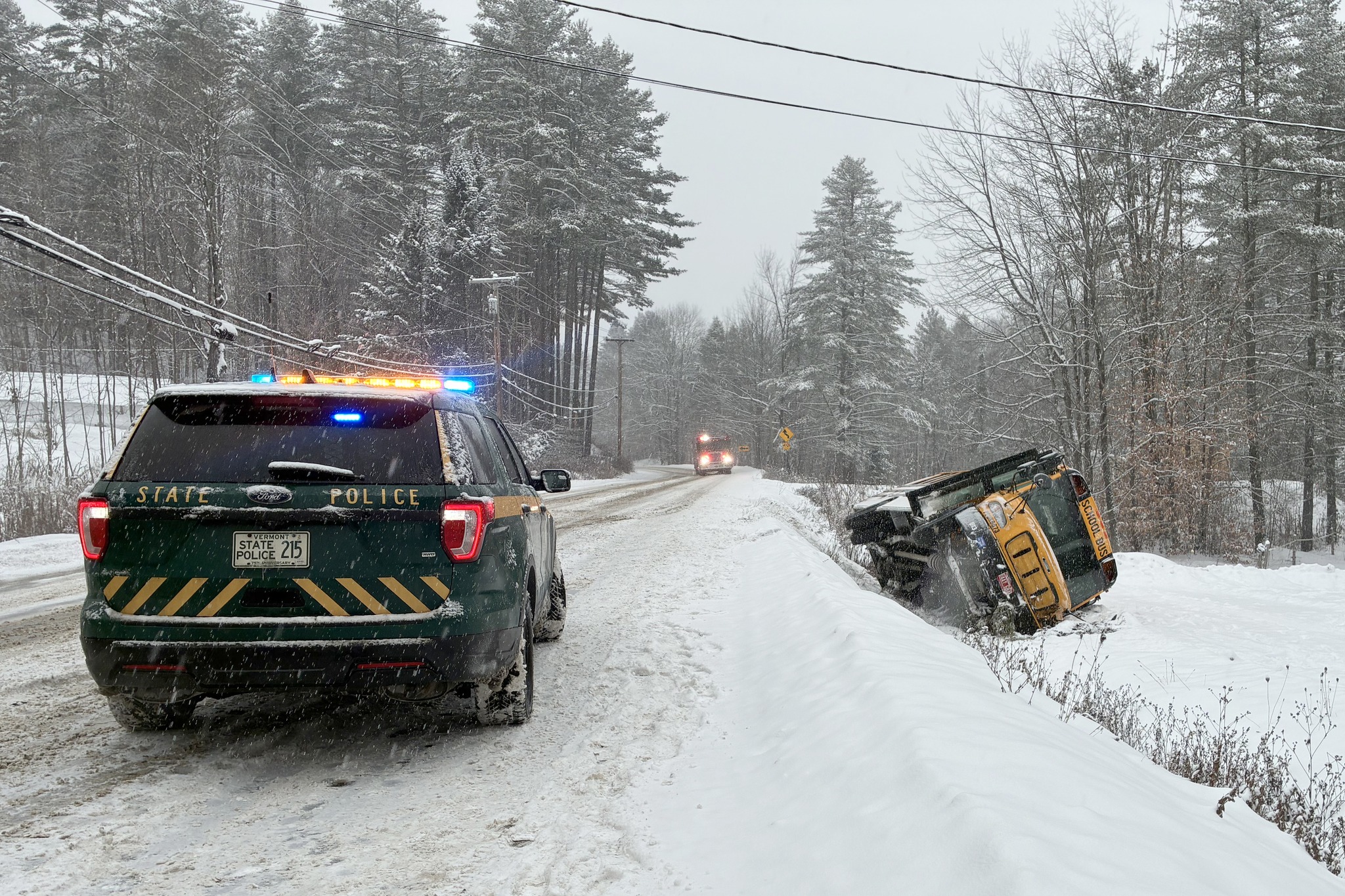 According to troopers, the spike in incidents included a school bus crash on Route 12 in Middlesex, where the vehicle went off the roadway and overturned. No students were on board at the time, and the driver suffered only minor injuries, police said. The overturning happened as the storm intensified across central Vermont, reducing visibility and coating roadways with packed snow.