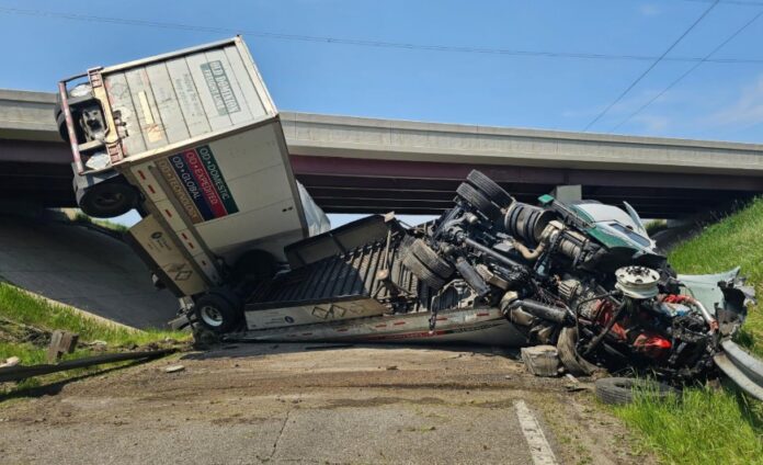 Otter Tail County, MN – A semi-truck veered off an overpass and plummeted to a road below after a crash involving two big rigs on Interstate 94 Wednesday morning, officials said.