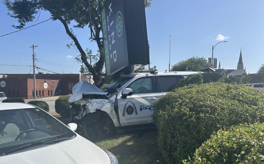 During the pursuit, a marked St. Louis police SUV with activated lights and siren collided with a Toyota sedan near South Broadway and Lafayette Avenue. The impact sent the police vehicle into a business sign at “Kind Goods” dispensary, causing significant front-end damage.