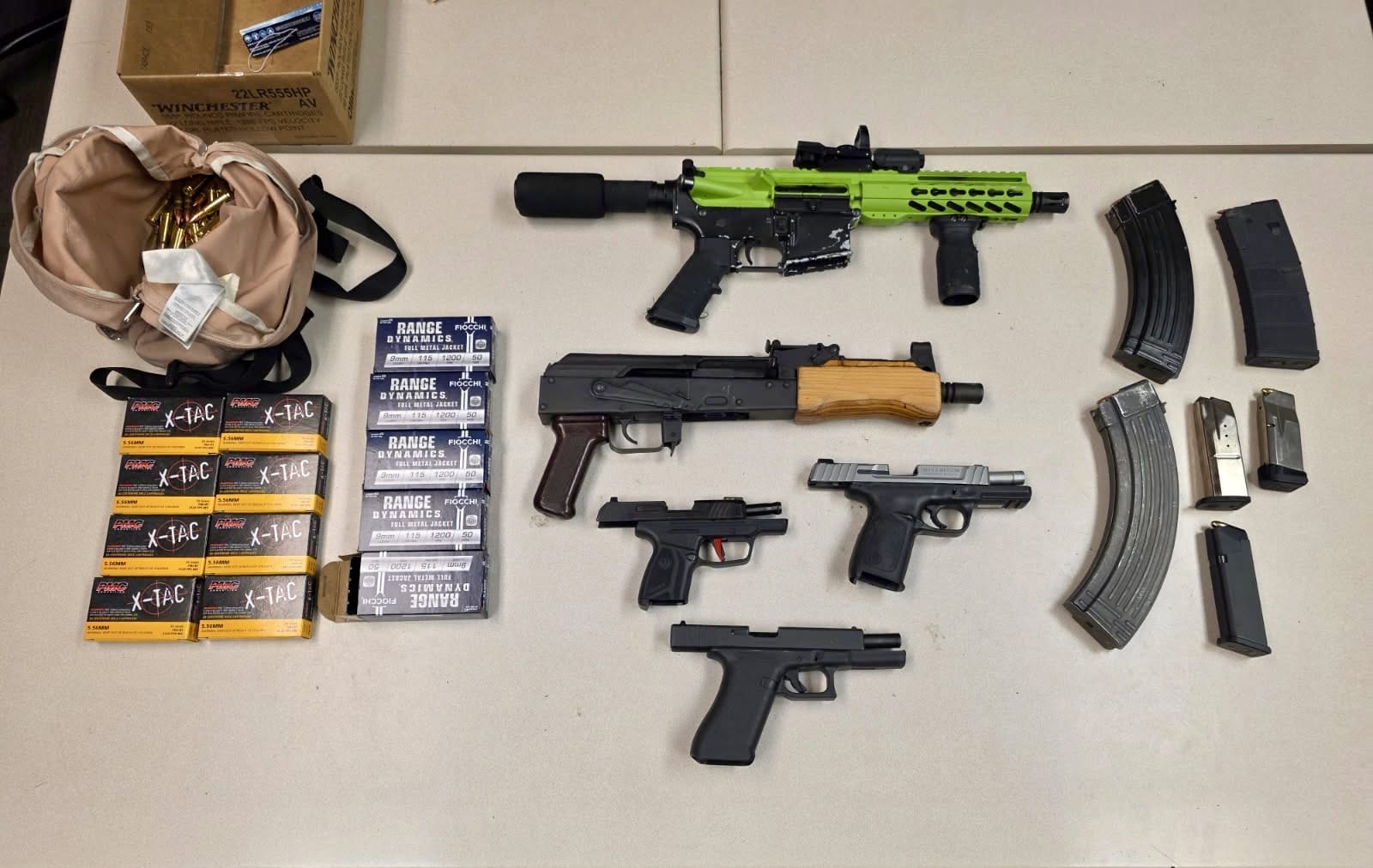 Authorities said a search of the vehicle allegedly uncovered two short-barreled rifles, three handguns, extended magazines, and hundreds of rounds of ammunition.