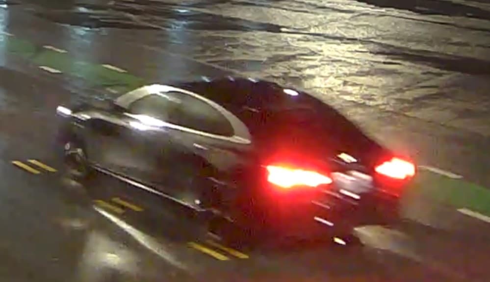 Authorities released a surveillance image showing the suspect vehicle speeding away from the scene. The car appears to be a dark-colored sedan with its taillights illuminated.