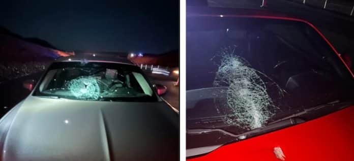 Henderson, NV – Two people were hospitalized Sunday night after large rocks were allegedly thrown from a pedestrian overpass onto vehicles traveling on US-95/IR-11 in Henderson, Nevada.
