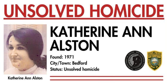 Bedford, NH – New Hampshire State Police have identified the victim in a 1971 unsolved homicide as 26-year-old Katherine Ann Alston of Boston, Massachusetts, following more than five decades of investigation.