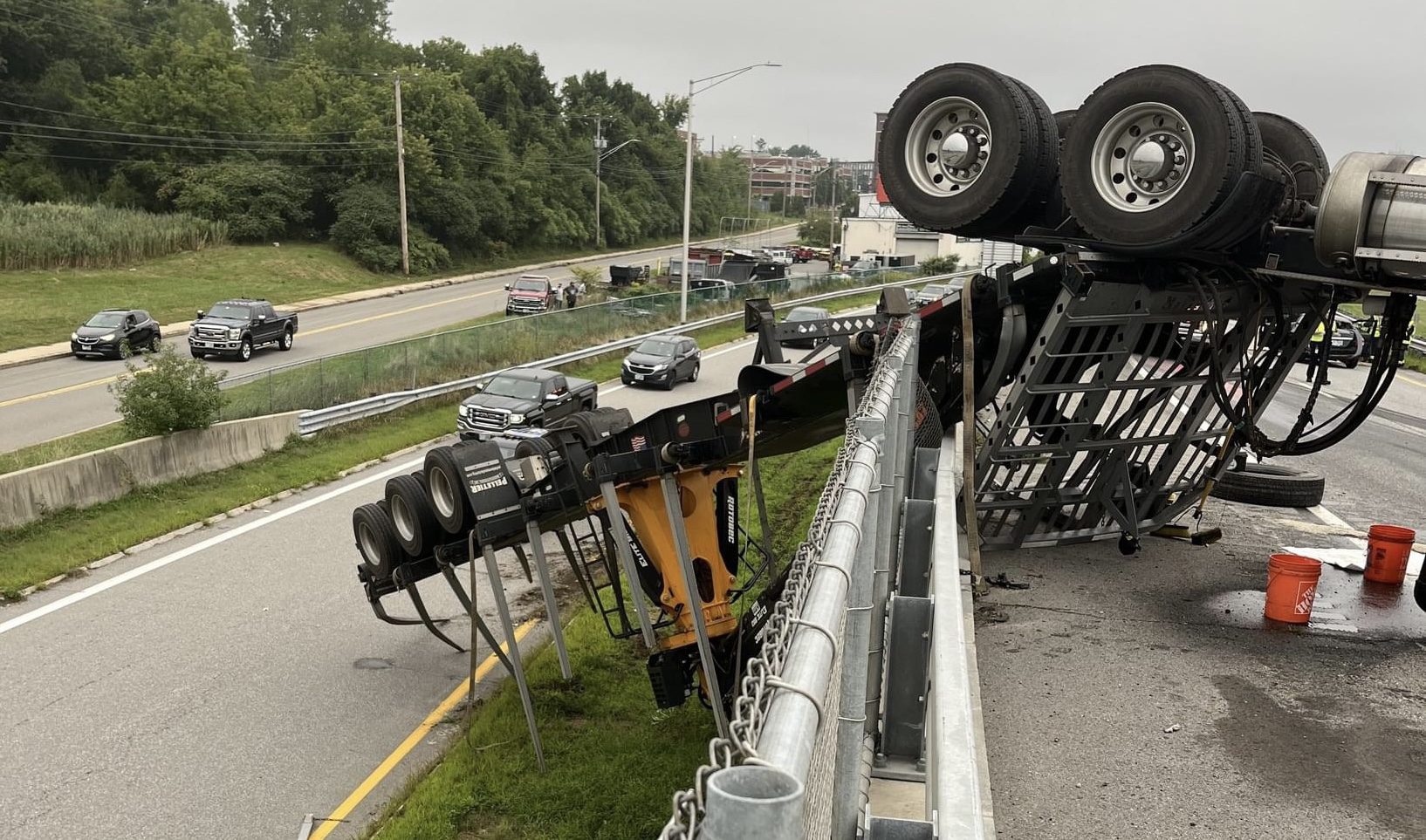 Manchester, NH – A collision involving a tractor-trailer and a compact car on Interstate 293 in Manchester led to a dramatic scene Friday morning, with the tractor-trailer left hanging over the edge of the Granite Street overpass. The accident prompted the closure of the highway for several hours.