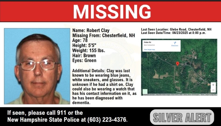 According to the New Hampshire State Police, Robert Clay was last seen around 8:00 p.m. Monday on Glebe Road, where he is believed to have left his residence on foot. Clay’s direction of travel is unknown.