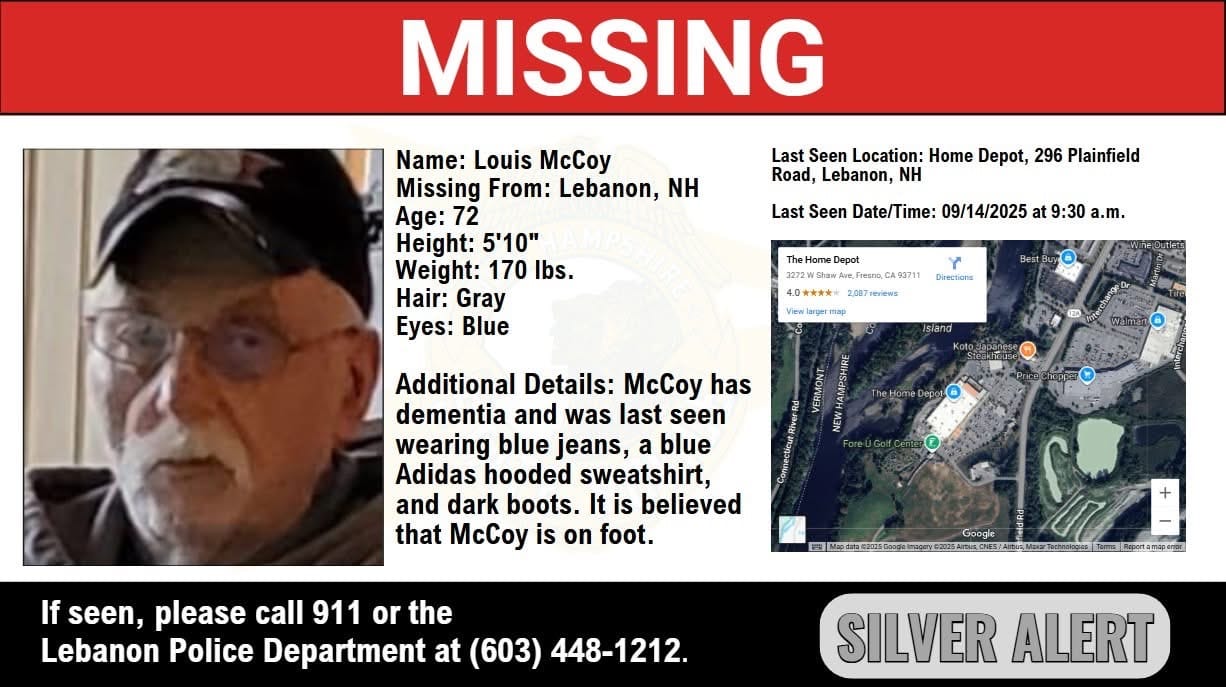 According to the New Hampshire State Police, the alert was activated at the request of the Lebanon Police Department after Louis McCoy was reported missing. Police say McCoy was last seen at approximately 9:30 a.m. on Saturday, September 14, 2025, when he left the Home Depot at 296 Plainfield Road in Lebanon. Investigators believe he is traveling on foot.