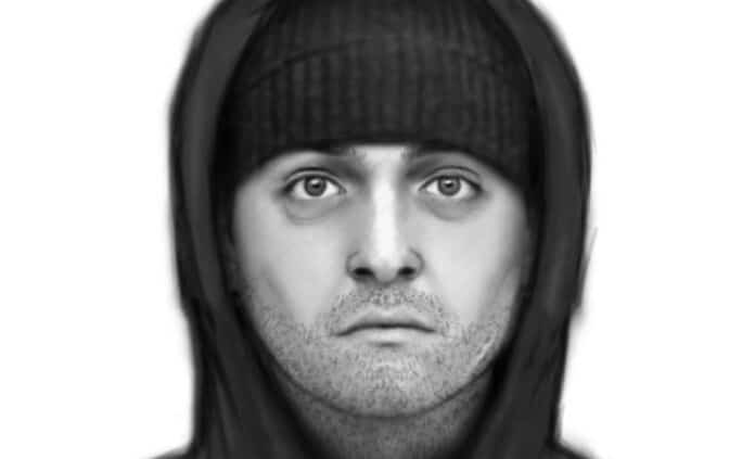 Police describe the suspect as a white male, approximately six feet tall, between 30 and 40 years old. He has light stubbly facial hair and a two-inch jagged scar on his left jawline. At the time, he wore a black beanie-style hat, an oversized black hoodie, black sweatpants, black socks, and black shoes.