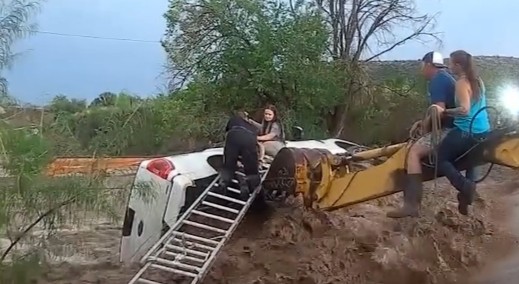 Grant County, NM – A New Mexico State Police officer rescued a woman, her young child and a dog from an overturned vehicle caught in swift floodwaters Monday afternoon in Grant County.