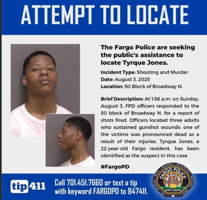 Fargo, ND – Police in Fargo are searching for a 22-year-old man in connection with a fatal shooting early Sunday, August 3, in downtown Fargo, part of two separate incidents that left two people dead and several others injured.
