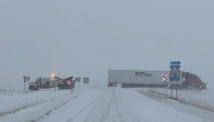 McKenzie, ND – Eastbound lanes of Interstate 94 near McKenzie are currently blocked after a semi-truck jackknifed Tuesday morning amid slick, snow-covered roadways.