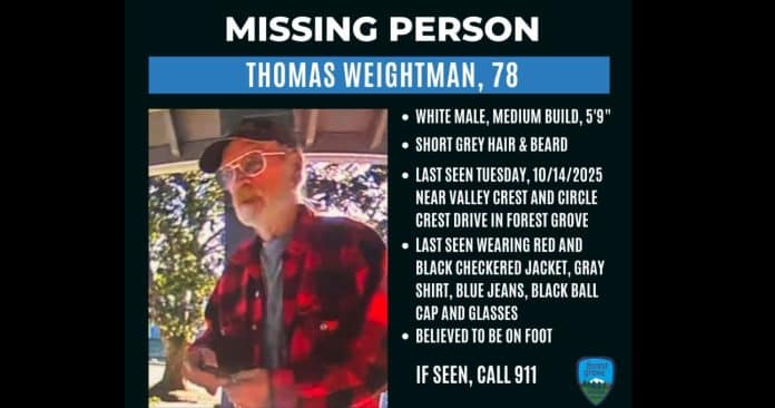 Forest Grove, OR – Authorities in Washington County are continuing to search for Thomas Weightman, 78, who was reported missing Tuesday, October 14, 2025, around 5:45 p.m. According to the Forest Grove Police Department, he was last seen by family earlier that morning near Valley Crest Way and Circle Crest Drive in Forest Grove.