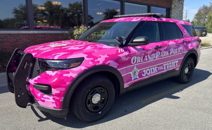 Orland Park, IL – The Orland Park Police Department has rolled out a new pink-wrapped cruiser in recognition of Breast Cancer Awareness Month. The specially designed vehicle, featuring a camouflage wrap and awareness ribbons, will be visible throughout October at community events and while on patrol.