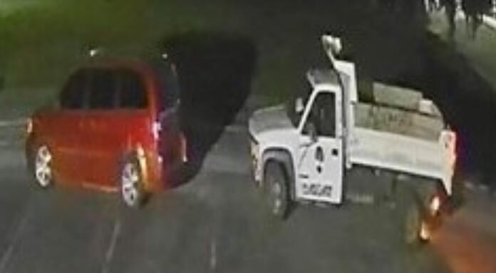 Police released images of two vehicles used in the incident—a red minivan and a white dump-style truck marked with possible signage—captured from security footage.
