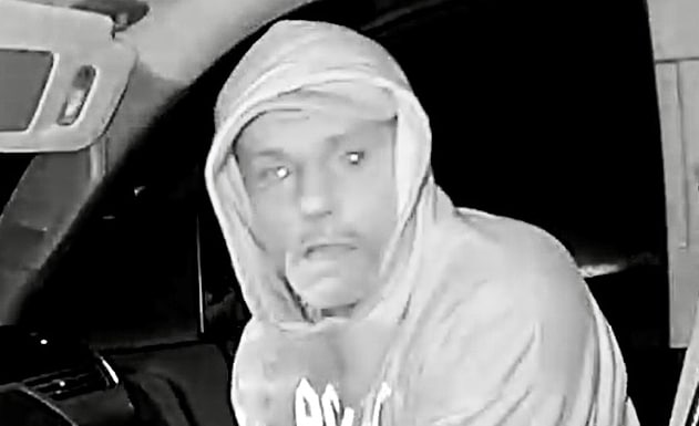 Surveillance images released by PSP show a man wearing a hooded sweatshirt inside a vehicle. He appears to have a cross tattoo on his left middle finger and another tattoo between his left thumb and pointer finger.