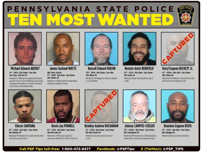 Harrisburg, PA – Pennsylvania State Police (PSP) have released their updated Top 10 Most Wanted list, urging the public to help track down fugitives wanted for violent crimes across the state. Two suspects have already been captured, while eight remain at large.
