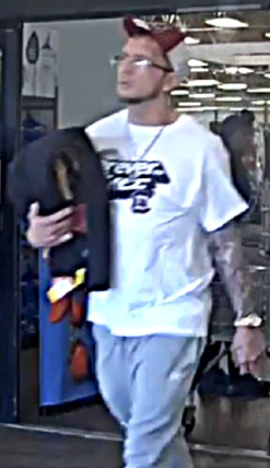Deputies released surveillance images as part of their weekly “Wanted Wednesday” effort, showing a man wearing a white T-shirt, gray pants, and a red cap. Investigators say the suspect has visible tattoos on his arms and was seen exiting the store carrying merchandise.