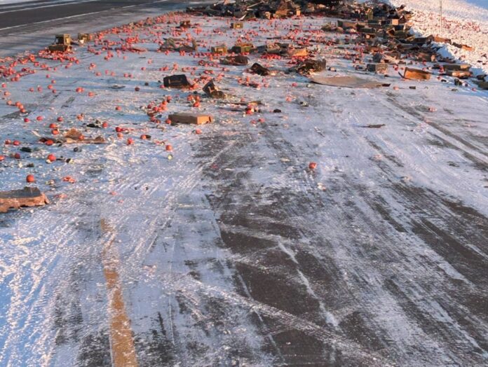 According to the Illinois Department of Transportation (IDOT), the produce spill occurred on I-55 in Sangamon County as crews were actively responding to overnight snow and ice. While the incident created what IDOT described as a “saucy situation,” officials confirmed there were no reported injuries.