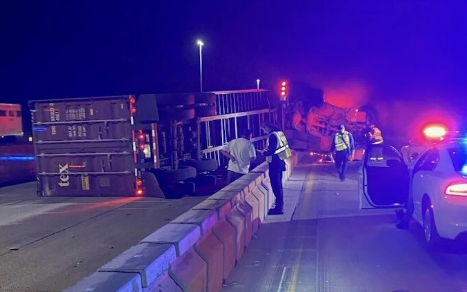 According to reports it happened around 3:45 a.m. Tuesday when a vehicle crashed into a semi, causing the semi to slam into the median wall before overturning onto its side. The impact led to the semi hitting some nearby construction machinery operated by two workers. No injuries were reported among the workers or drivers.