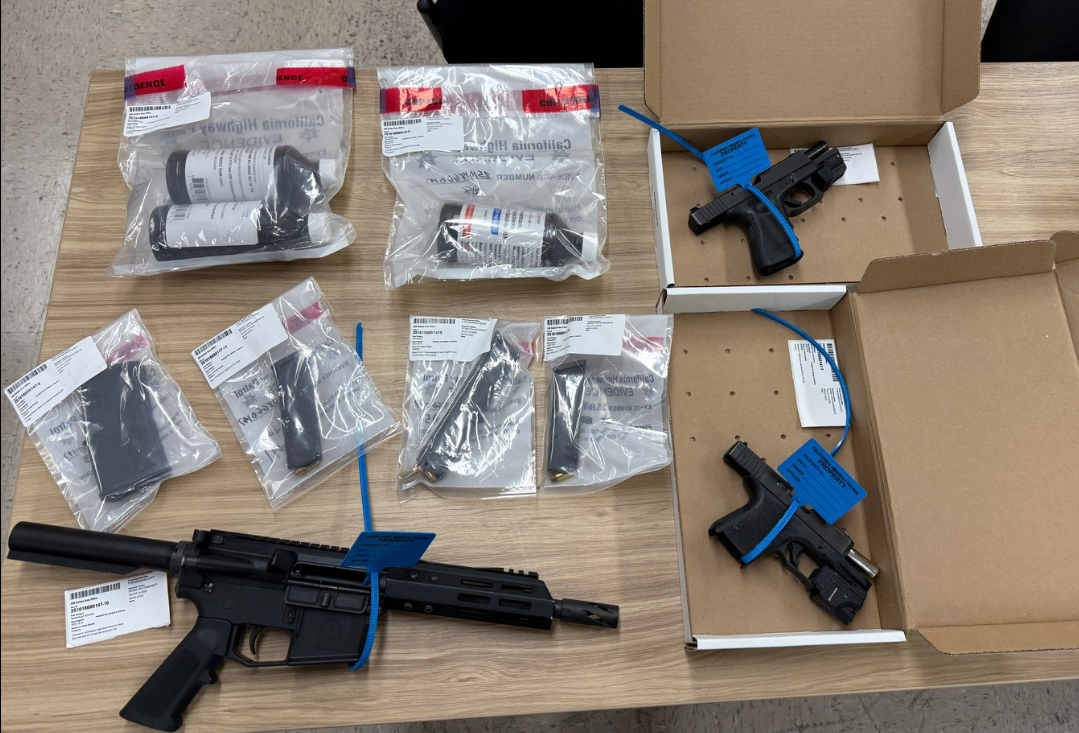 According to CHP, the driver was arrested for driving under the influence. During a subsequent search of the vehicle, officers reportedly discovered a loaded, unserialized short-barreled rifle, a pistol, and three bottles of unprescribed promethazine. A second pistol and extended magazine were also found on one of the passengers.