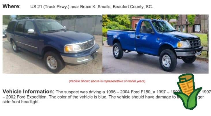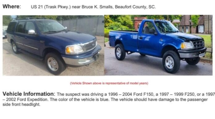 Authorities are searching for a blue 1996–2004 Ford F150, a 1997–1999 Ford F250, or a 1997–2002 Ford Expedition, which is believed to have damage to the passenger-side front headlight. The vehicle was last seen in the area of US 21 (Trask Parkway), near Bruce K. Smalls in Beaufort County.