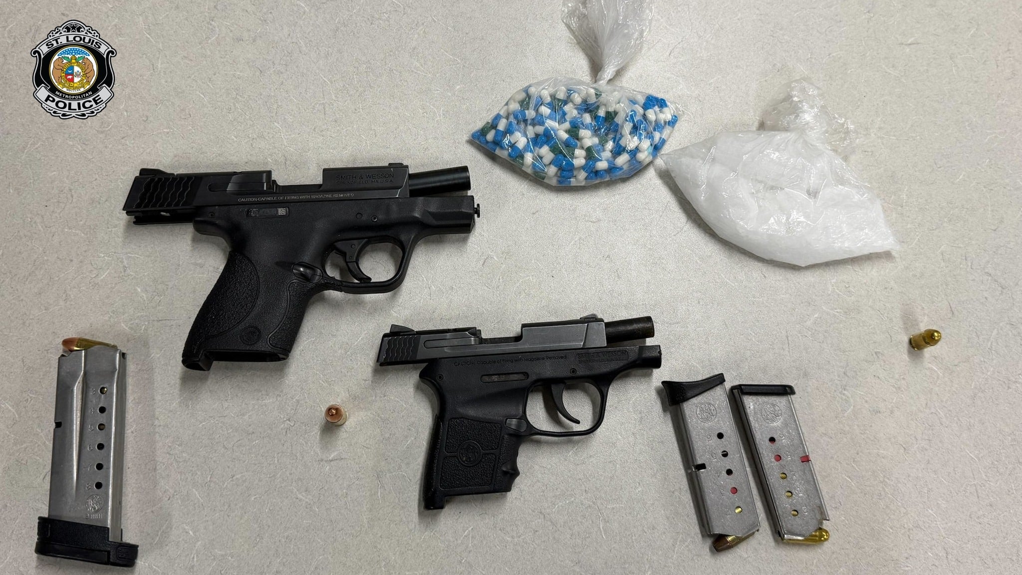 Images released by SLMPD show two handguns, ammunition magazines, and bagged substances believed to be narcotics laid out as evidence. Charges against the suspect are pending, and the case remains under active investigation.