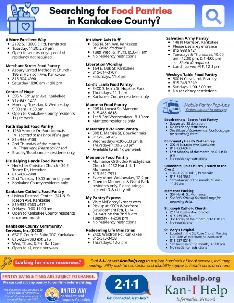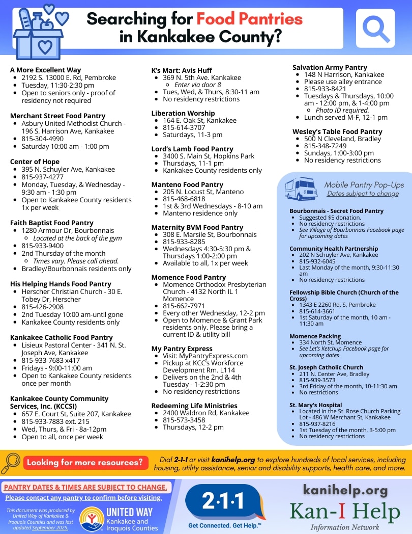 Kankakee, IL – United Way is encouraging local employers and employees in Kankakee and Iroquois counties to share and use updated food pantry directories now available at myunitedway.org/food. The lists are maintained regularly and include locations and hours for pantries across both counties.