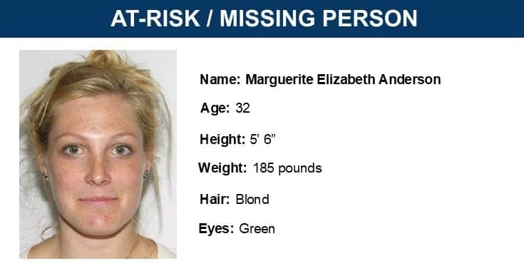 According to the Virginia State Police, Marguerite Elizabeth Anderson was last seen on Monday, May 5, at 46954 Fairhills Court in Sterling. She is described as 5 feet 6 inches tall, weighing approximately 185 pounds, with green eyes and blonde hair. She was reportedly wearing an unknown description of clothing and is not believed to be driving a vehicle.