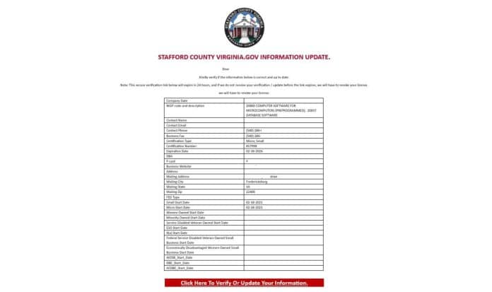 According to a notice shared Friday on the Stafford County Government’s official Facebook page, residents have reported receiving fraudulent emails and text messages disguised to look like they are from county offices. The messages, which carry the Stafford County seal and official-style formatting, falsely claim that recipients must verify or update information or risk losing a license.