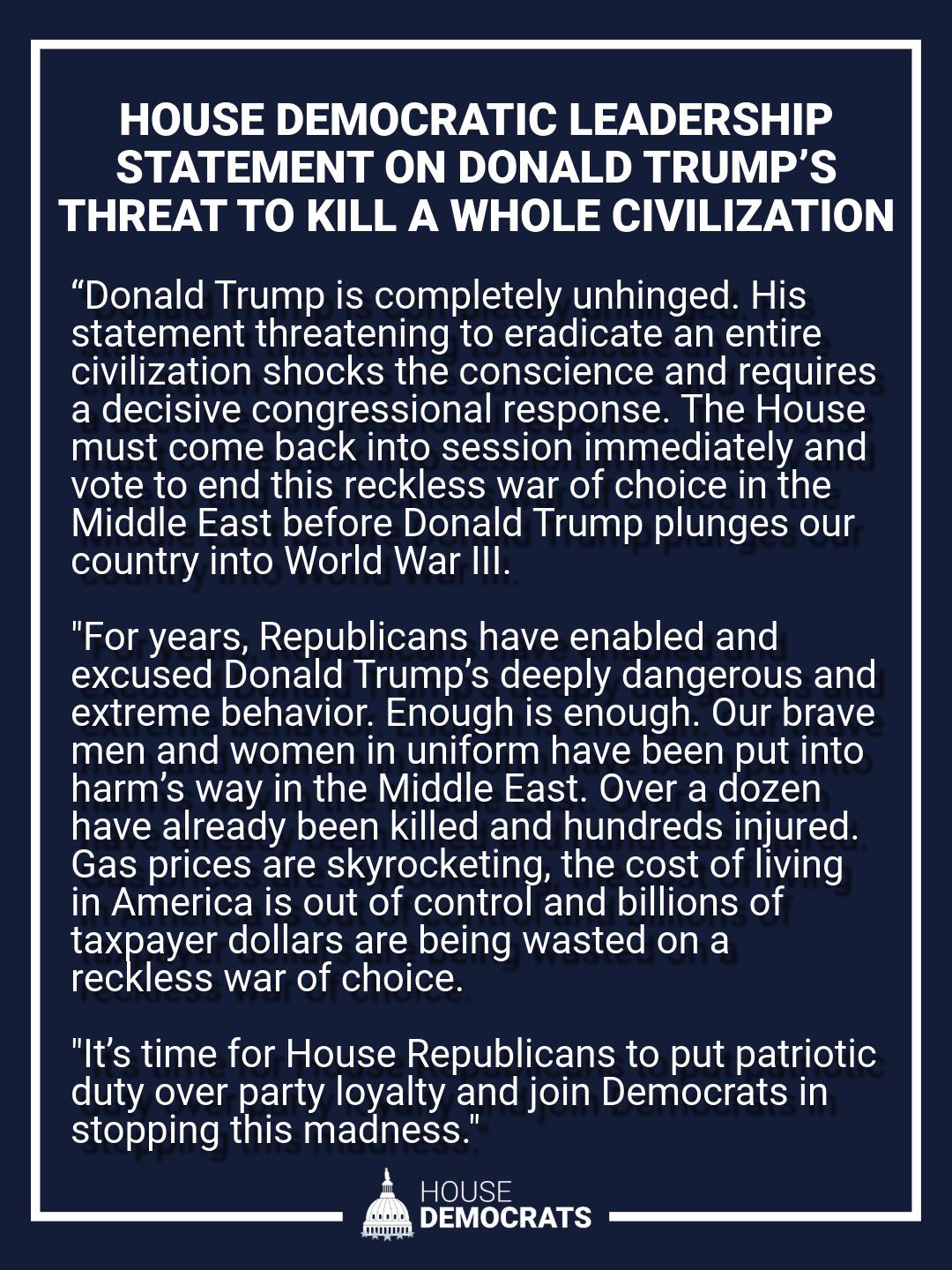 According to an official statement, leaders said Trump’s message “threatening to eradicate an entire civilization shocks the conscience and requires a decisive congressional response.”