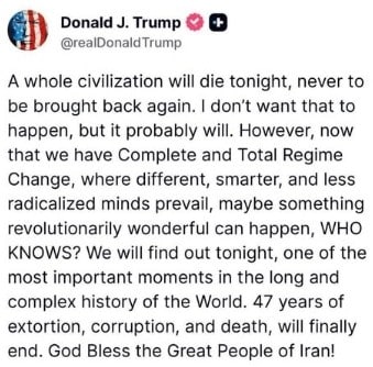 According to screenshots of the post circulating on Tuesday, the President wrote that while he does not want such an outcome to happen, “it probably will.” The message also referenced “Complete and Total Regime Change” and claimed that “47 years of extortion, corruption, and death, will finally end.”