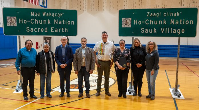 Baraboo, WI – Wisconsin officials and Tribal leaders gathered Thursday to unveil the newest set of Ho-Chunk dual-language highway signs now being installed across several counties. The signs, part of the Wisconsin Department of Transportation’s Dual-Language Sign Program, identify Ho-Chunk communities and the Mississippi River in both Ho-Chunk and English.