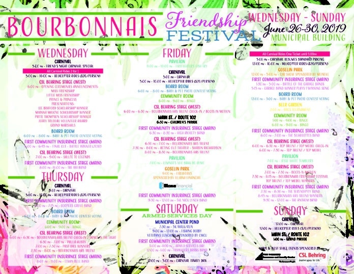 The Bourbonnais Friendship Festival has released the full schedule for this week’s coming activities for the annual summer celebration.