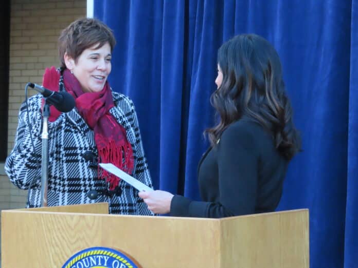 WILL COUNTY – In front of a small gathering today outside of the Will County Office Building in Joliet, recently elected Will County Executive Jennifer Bertino-Tarrant was sworn into office by County Clerk Lauren Staley-Ferry. A lifelong resident and the first woman elected to the county-wide position, Bertino-Tarrant acknowledged the positive direction the county is headed while pointing to the immediate challenges of navigating the COVID-19 pandemic safely for residents and businesses.