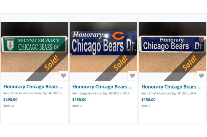Eight auctions for the street signs previously displayed throughout the Village of Bourbonnais during Training Camp from 2002 to 2019 ended after a ten-day run Sunday night. The eight remaining signs made of heavy-duty aluminum ranging in size sold for a combined $1,530.