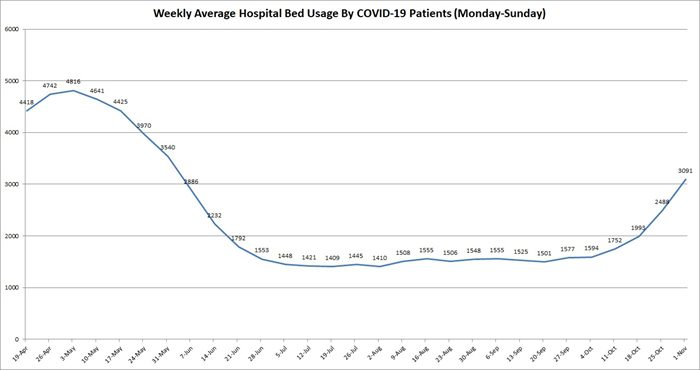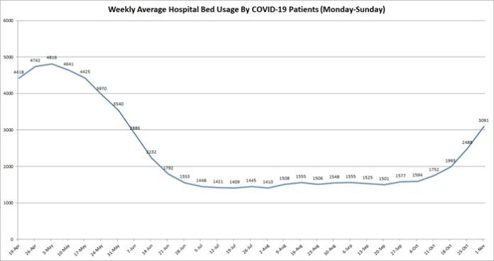 A Capitol News Illinois analysis of weekly hospitalization averages shows the average number of hospital beds in use by COVID-19 patients for the week ending Nov. 1 increased by 603, or 24 percent, from the week prior. There were 3,091 hospital beds in use on average last week, an increase of 55 percent from two weeks prior and 94 percent from the week ending Oct. 4.