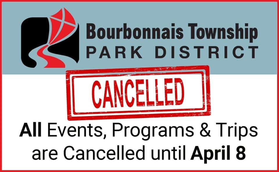Bourbonnais Township Park District announced today all events, programs and trips through April 8th have been canceled. The move comes on the recommendations of Gov. Pritzker while “protecting the health and safety our residents and staff,” BTPD said in a social media post earlier today.