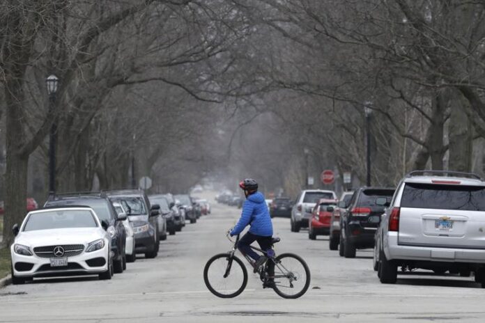 A resident rides his bicycle on the street in Evanston, Ill., Friday, March 27, 2020. AP Photo/Nam Y. Huh