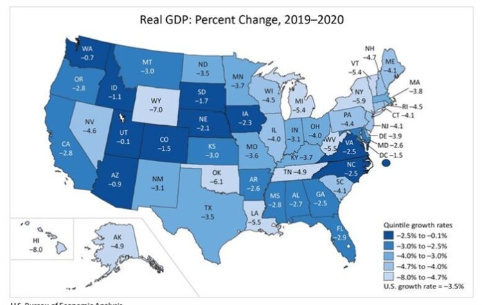 According to BEA, real gross domestic product decreased in all 50 states and the District of Columbia in 2020. Utah, with a 0.1 percent shrinkage rate, fared the best, while Hawaii’s state economy shrank 8 percent. The average shrinkage rate for the U.S. as a whole was 3.5 percent.