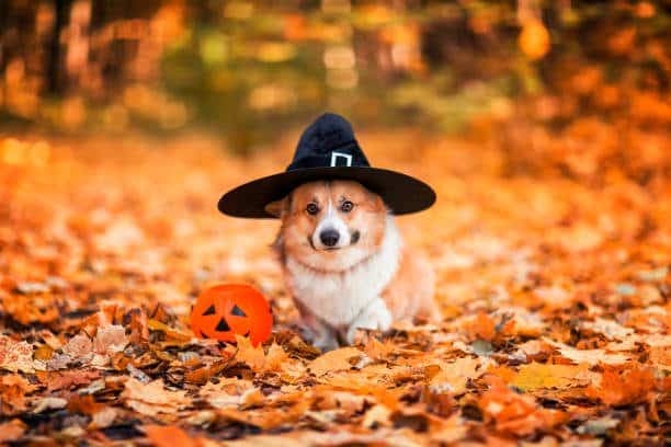 cute corgi dog puppy in autumn sunny park walks in the Halloween witch 's cap