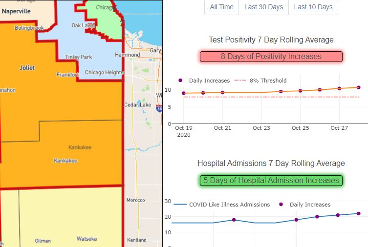 Last Wednesday, 1,307 tests were processed in Kankakee County resulting in 116 confirmed cases for a seven day rolling average of 8.6%, a new record for the County. In Will County, 2,929 tests were processed the same day with 383 confirmed cases for an 11.4% weekly rolling average.