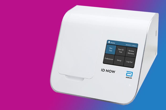 The new testing procedure works when a swab taken from a person’s nose or throat mixed into a chemical solution, which is analyzed and detects the COVID-19 genome within minutes. Abbott labs received FDA approval in late March and began shipping units shortly after. To date, nearly half a million units have shipped in the U.S.
