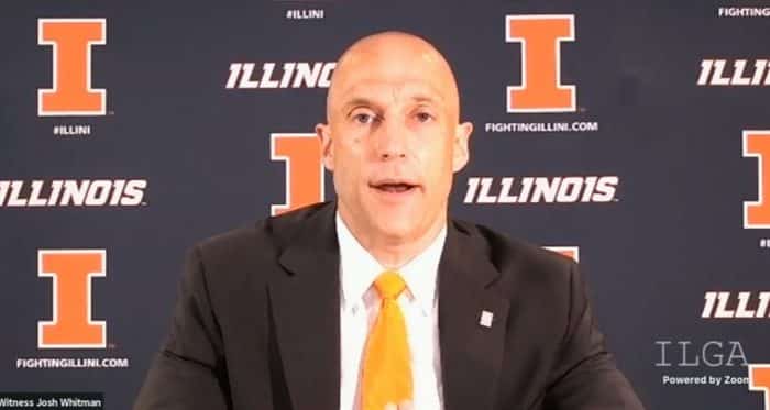 Illinois Athletic Director Josh Whitman speaks to the Illinois House Executive Committee Wednesday in opposition to a proposed change to state gambling laws that would allow Illinoisans to bet on in-state colleges and universities legally. (Credit: Blueroomstream.com)