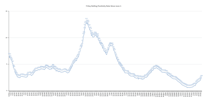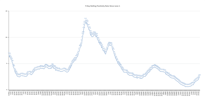 All numbers, while rising amid a nationwide surge sparked by a more contagious virus variant, were well off pandemic highs when the positivity rate rose above 13 percent last winter and COVID-19 hospitalizations peaked above 6,000, with ICU bed usage topping 1,200.