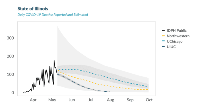 Illinois released new state models from researchers at some of Illinois’ top educational institutions on Monday, which predict plateauing peak expanding from mid-May into mid-June in Illinois.