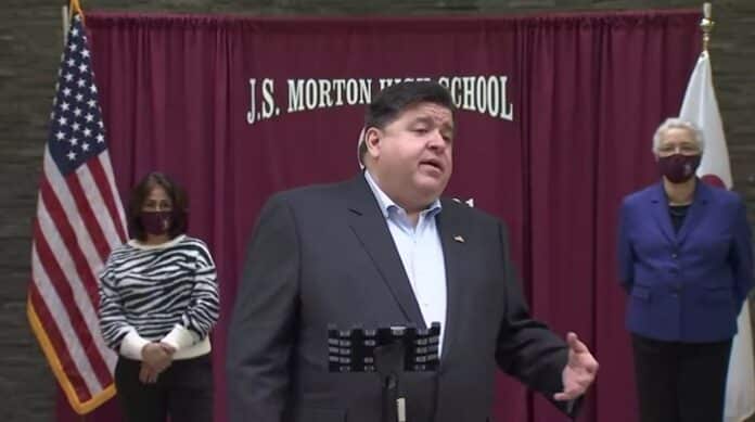 Gov. JB Pritzker speaks during a news conference Thursday at J. Sterling Morton High School in Cicero to provide an update on the state’s response to the COVID-19 pandemic. (Credit: blueroomstream.com)