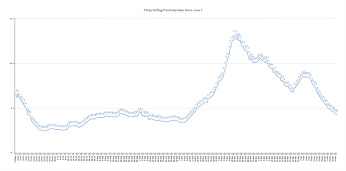 The vaccination rollout continues amid falling positivity rates. On Friday, the state’s rolling seven-day average case positivity rate was 4.3 percent, marking the 21st straight day it has decreased and the lowest it has been since Oct. 12.