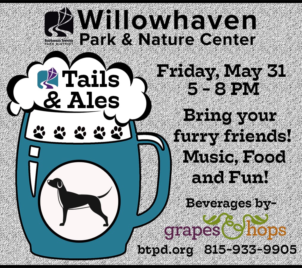 The Bourbonnais Township Park District along with Grapes & Hops are partnering this Friday for the first annual Tails & Ales event at Willowhaven Park & Nature Center at 1451 N 4000 E Road in Kankakee.